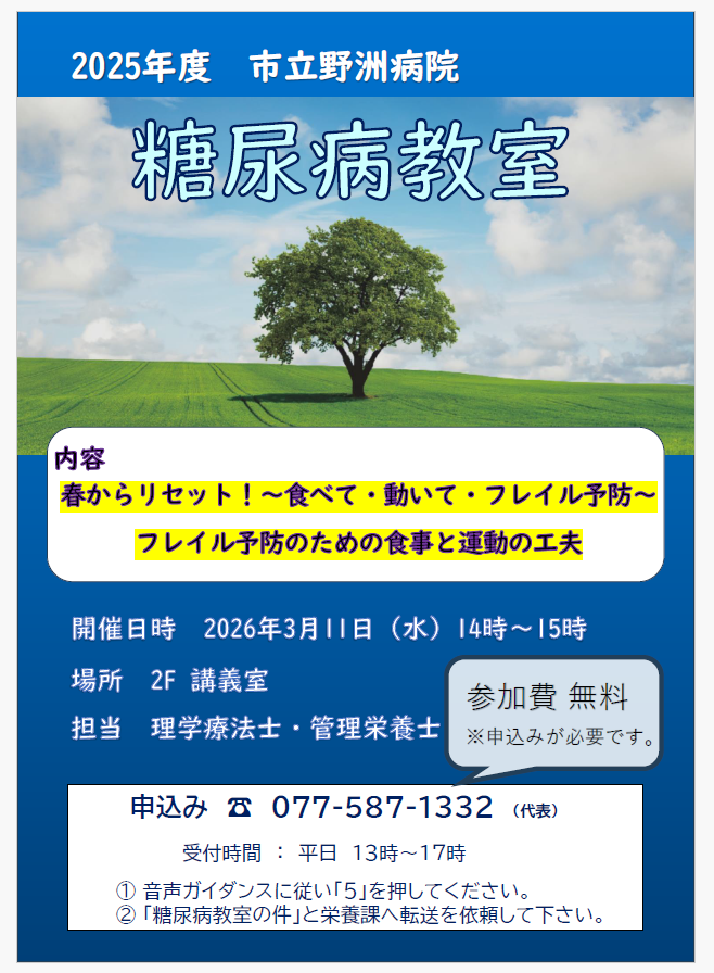 3月11日(水)に、2025年度 第4回 糖尿病教室を開催いたします。 『春からリセット! ~食べて・動いて・フレイル予防~ フレイル予防のための食事と運動の工夫』と題して、管理栄養士と理学療法士がお話します。奮ってご参加ください。お申込先・詳細は以下のリンクよりご確認ください。